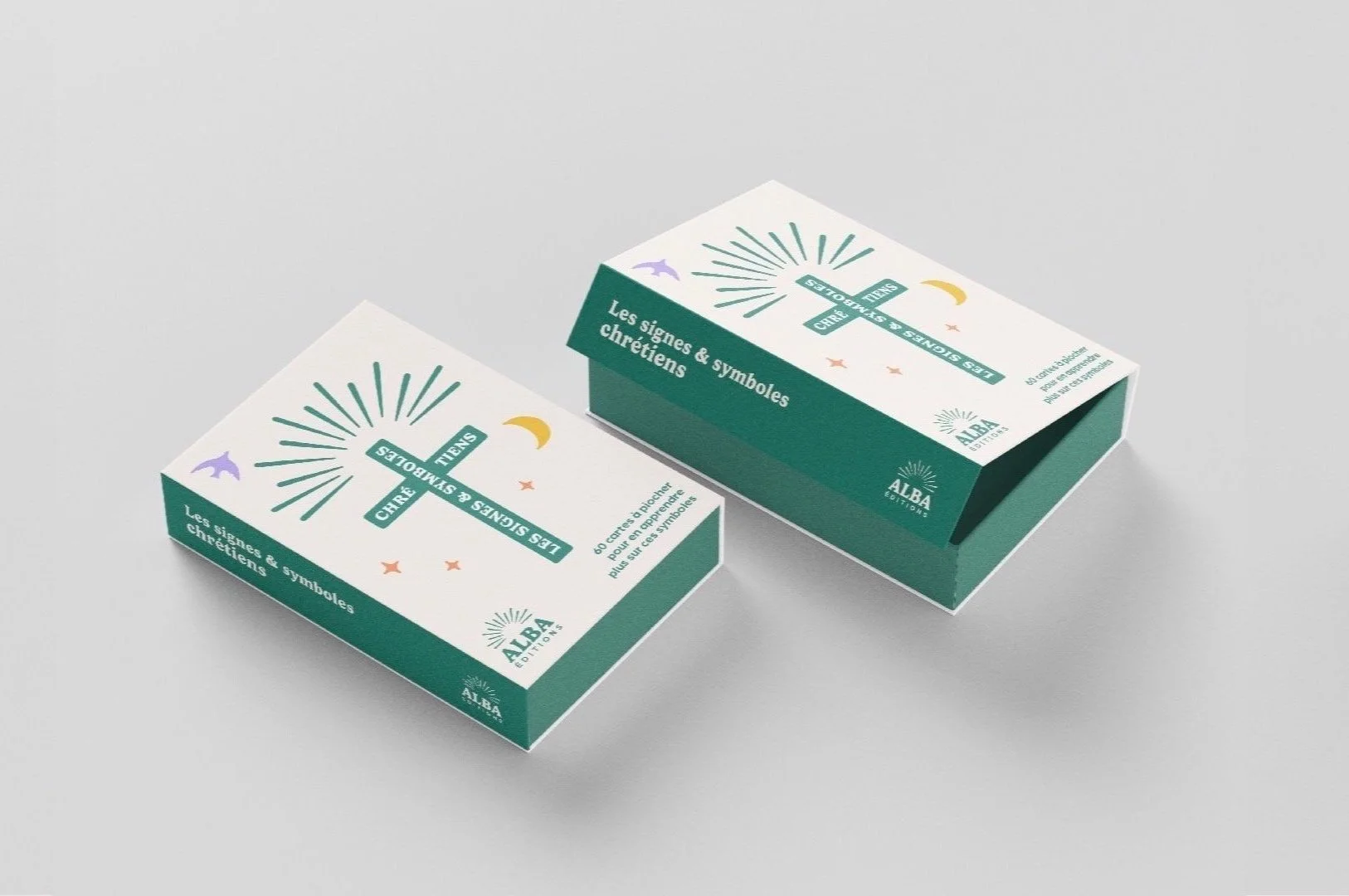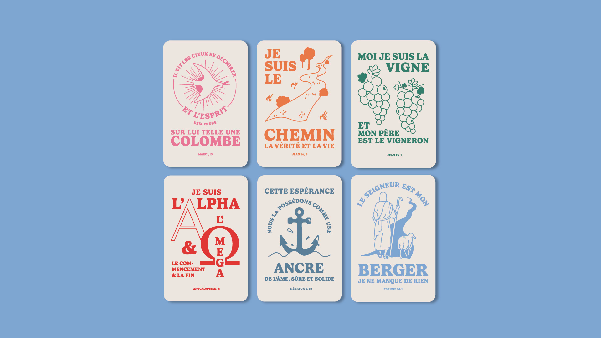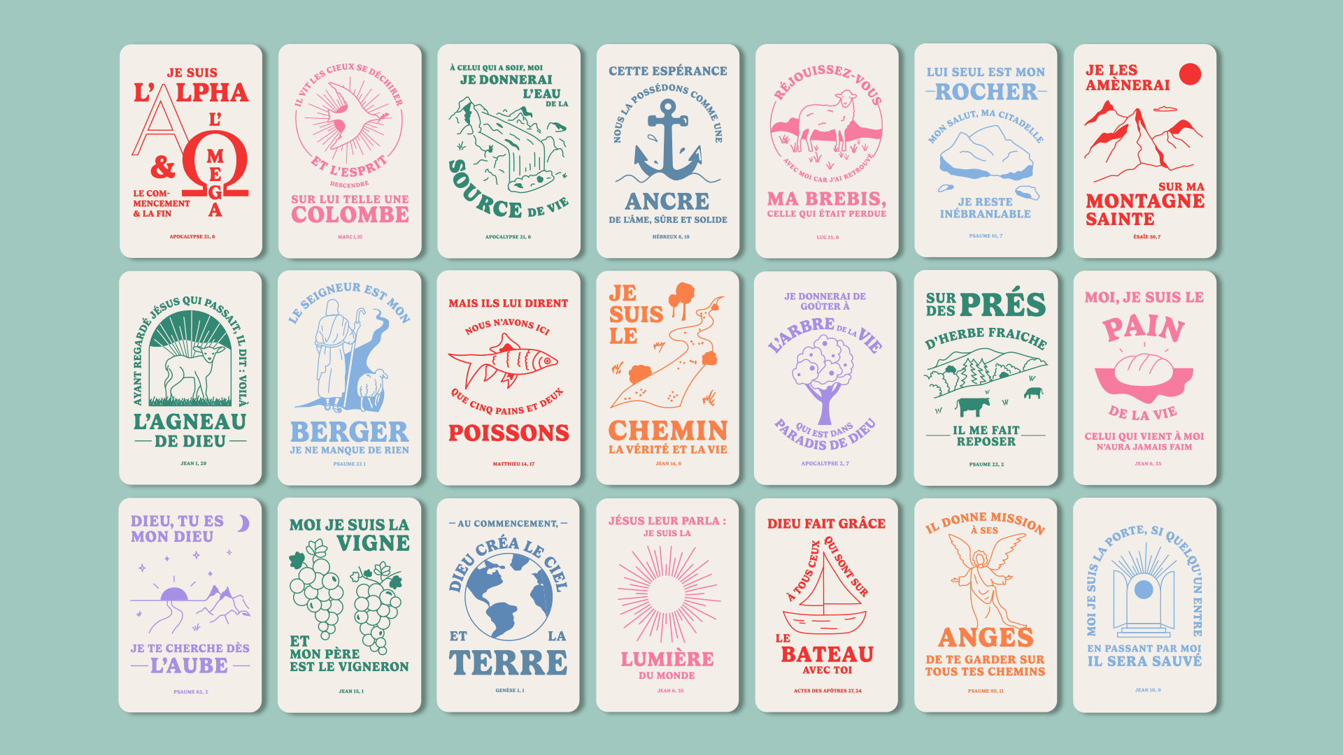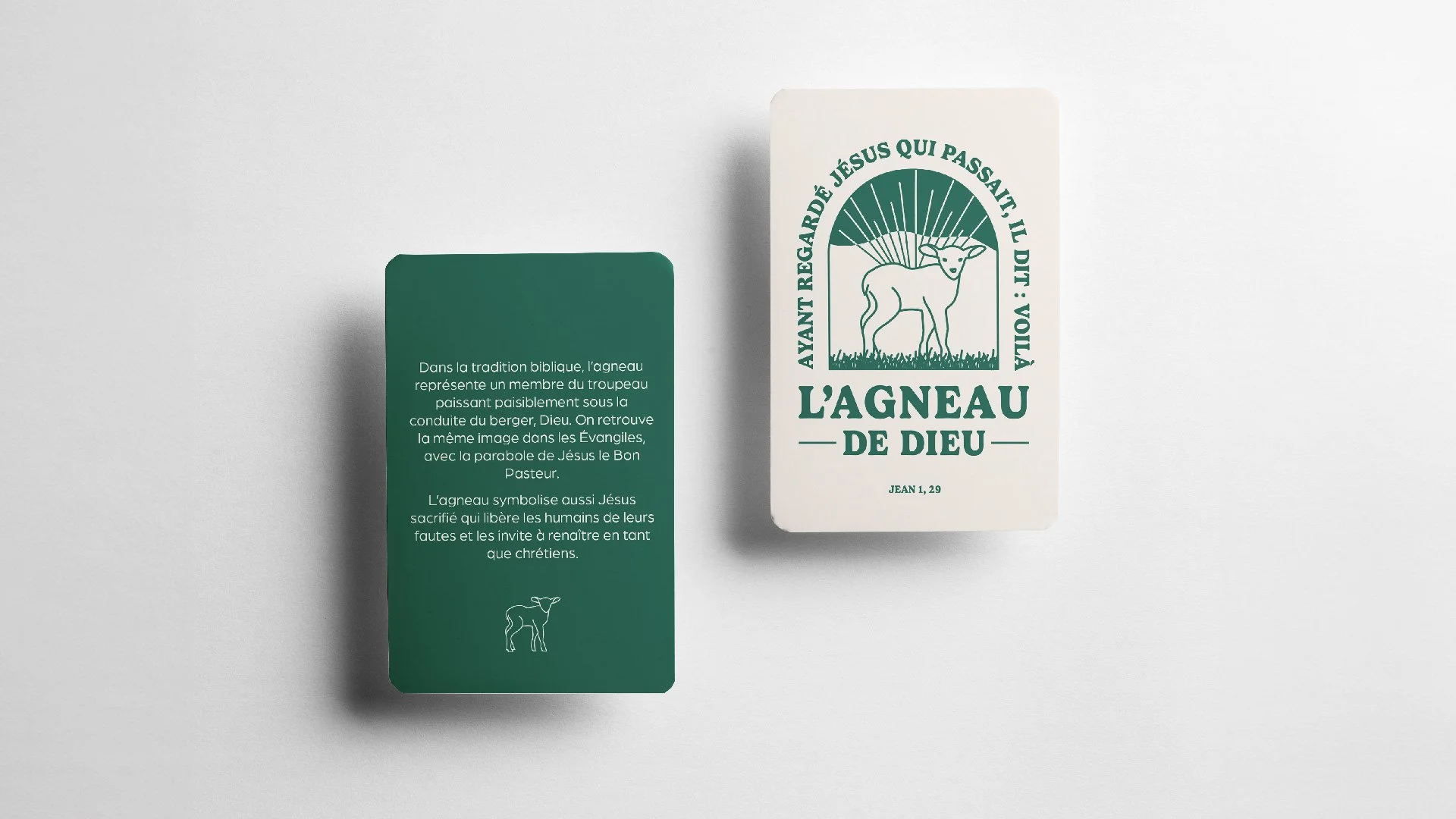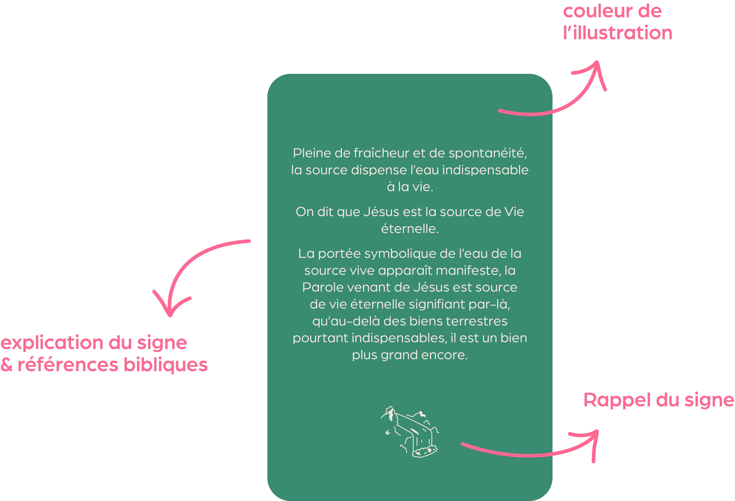 Ces cartes mettent en avant un symbole associé à une citation de la bible. Le dos de la carte vient apporter quelques explications et référence sur le signe.